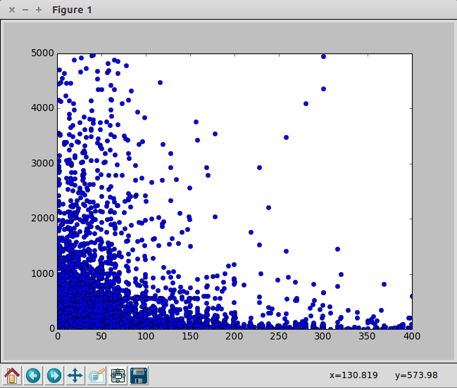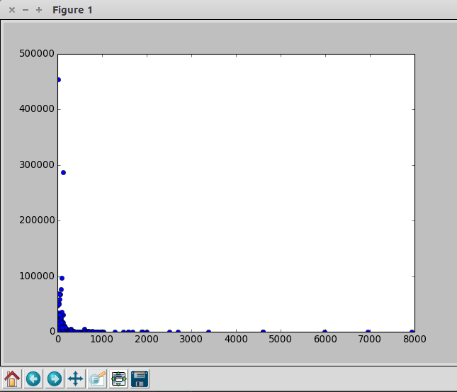 # coding:utf-8import numpy as npimport pymysqlimport pandas as pdaimport matplotlib.pylab as pylconn = pymysql.connect(host="127.0.0.1", user="root", passwd="xxxxxx", db="csdn", charset='utf8')sql = "select * from taobao"data = pda.read_sql(sql, conn) [/code][/code][/code]```code這樣就可以得到我們的原始數(shù)據(jù)了。 [/code]2. 數(shù)據(jù)清洗之發(fā)現(xiàn)缺失值并對缺失值進(jìn)行處理 取到數(shù)據(jù)之后就開始準(zhǔn)備處理數(shù)據(jù)。第一步,是先觀察數(shù)據(jù),或者是了解數(shù)據(jù)的屬性等特征。比如我們可以看到數(shù)據(jù)中含有下面的屬性值:![]()  一共有9616條數(shù)據(jù),一共有四列數(shù)據(jù),也就是四個(gè)屬性值,分別為:title,link,price, comment。對應(yīng)于該商品的名稱,鏈接,價(jià)格和評論數(shù)。下面對這些數(shù)據(jù)中的NA值進(jìn)行清洗:```codex = 0data["price"][(data["price"]==0)] = Nonefor i in data.columns:for j in range(len(data)):if(data[i].isnull())[j]:data[i][j] = 64x += 1print(x) [/code]將價(jià)格為空的數(shù)據(jù)的價(jià)格標(biāo)為64.3. 發(fā)現(xiàn)大量數(shù)據(jù)中的異常值并清洗 首先,為了更加直觀地觀察到異常值,我們可以通過作圖來發(fā)現(xiàn)。```codedata2 = data.Tprice = data2.values[2]comment = data2.values[3]pyl.plot(price, comment, "o")pyl.show() [/code]![]()  由于范圍比較大,我們作出的價(jià)格與評論數(shù)的散點(diǎn)圖分布并不很直觀。因此,我們考慮縮小范圍,將評論數(shù)大于5000的和價(jià)格大于400的都視為異常值,那我們就假設(shè)這樣處理好了,異常數(shù)據(jù)的選取都是可以自己調(diào)整范圍,逐步根據(jù)自己做出來的圖形進(jìn)行判斷:```codeline = len(data.values)col = len(data.values[0])dt = data.valuesfor i in range(0, line):for j in range(0, col):if dt[i][3] > 5000: # commentdt[i][3] = 562 [/code]```codeif dt[i][2] > 400: # pricedt[i][2] = 64dt2 = dt.Tprice = dt2[2]comment = dt2[3]pyl.plot(price, comment, "o")pyl.show() [/code]然后再次作圖,得到如下效果:![]() 得到這樣的圖看起來數(shù)據(jù)就集中多了。賣家可以通過自己的賣的平時(shí)的價(jià)格區(qū)間截取更加細(xì)致的區(qū)間,評論數(shù)可以一定程度上代表銷量,可以從中分析出最好的價(jià)格制定點(diǎn),可以幫助賣家制定合理的價(jià)格,獲得盡可能大的收益。4. 數(shù)據(jù)的離散化處理及分布的分析 要觀察數(shù)據(jù)的分布,我們最好是通過作出數(shù)據(jù)的直方圖來觀察。因此我們計(jì)算數(shù)據(jù)的最大值和最小值,計(jì)算組距(極差/組數(shù)),繪制直方圖。計(jì)算最值:```codeprice_max = dt2[2].max()price_min = dt2[2].min()comment_max = dt2[3].max()comment_min = dt2[3].min() [/code]計(jì)算極差:```codeprice_rg = price_max - price_mincomment_rg = comment_max - comment_min [/code]計(jì)算組距:```codeprice_dist = price_rg/13comment_dist = comment_rg/13 [/code]繪制直方圖:```codeprice_sty = np.arange(price_min, price_max, price_dist)pyl.hist(dt2[2], price_sty)pyl.show()comment_sty = np.arange(comment_min, comment_max, comment_dist)pyl.hist(dt2[3], comment_sty)pyl.show() [/code]繪制出來的效果為:![]()  價(jià)格的直方圖![]()  評論直方圖這里是將數(shù)據(jù)范圍縮減到更小之后求得的數(shù)據(jù)。評論數(shù)是大于65設(shè)置為35,價(jià)格大于100的設(shè)置為64。然后進(jìn)一步分析數(shù)據(jù)的分布規(guī)律。兩個(gè)直方圖中的峰值柱與我們處理數(shù)據(jù)時(shí)的設(shè)置值有非常大的關(guān)系,因此我們可以弱化這一列的特征,對整個(gè)數(shù)據(jù)進(jìn)行分析。總結(jié)